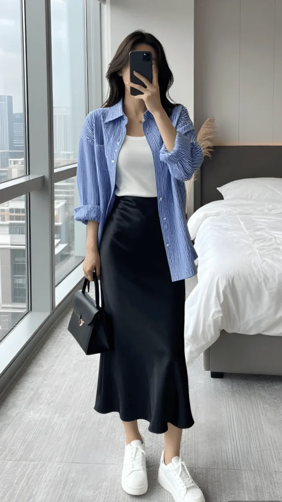 This outfit is a love letter to easy layering. A blue and white pinstriped button-down, worn open and slightly oversized, falls over a simple white tank and a flowing navy satin midi skirt. White platform sneakers and a small black structured bag keep things contemporary. The whole look has a beautiful sense of movement — the shirt billowing slightly, the skirt swishing, everything caught between relaxed and refined. It’s a mirror selfie outfit that translates perfectly to real life.