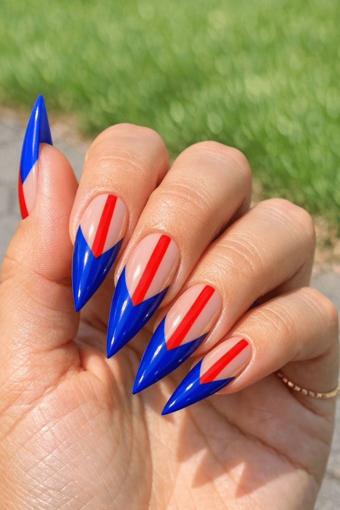 These graphic, geometric stilettos — royal blue V-shaped tips with a bold vertical red stripe running up the center of the nude base — are pure visual energy. Photographed outdoors in natural light against a grass backdrop, they feel sporty and editorial at the same time, like a fashion-forward take on patriotic color-blocking. These bold spring nail trends 2026 bring graphic design sensibility into the nail art space with real confidence and clarity.