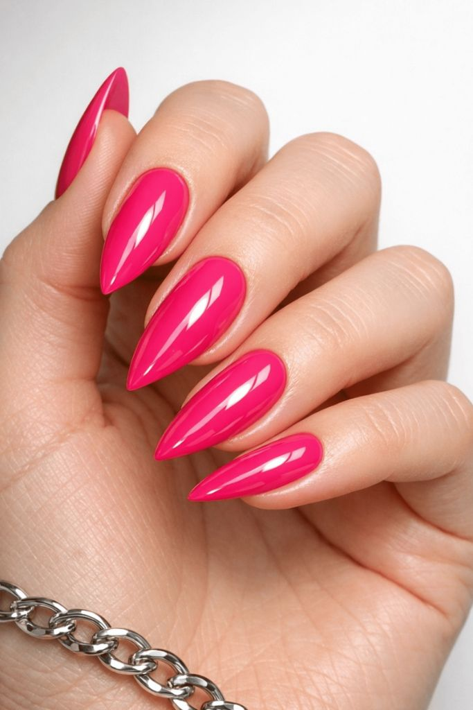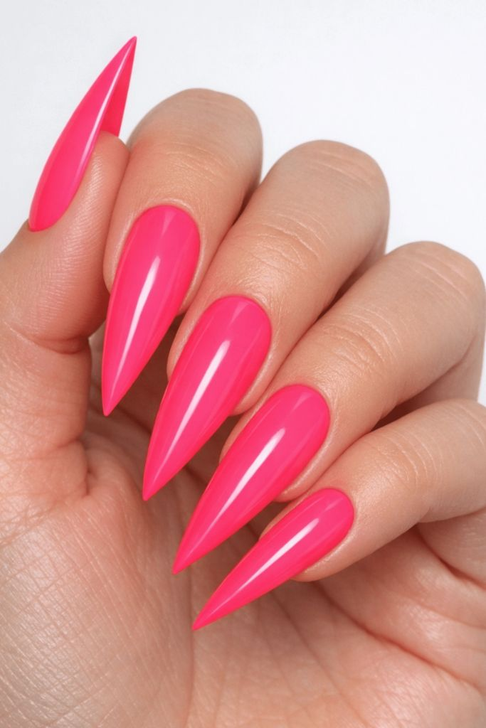 We close with the most joyful, unambiguous statement of the entire collection: pure, blazing neon hot pink stiletto nails in a high-gloss finish, nothing added, nothing subtracted. Just that perfect, incandescent pink that seems to generate its own light source. These are pink spring stiletto nails in their purest, most distilled form — and somehow, by being exactly what they are without compromise, they become the most powerful look of all.