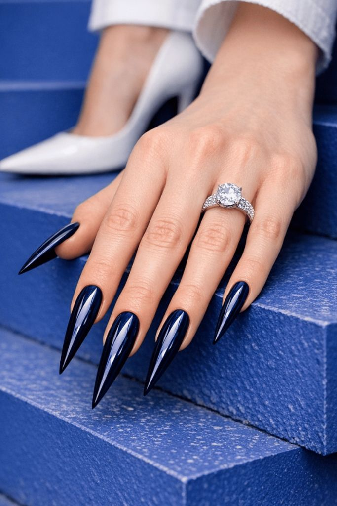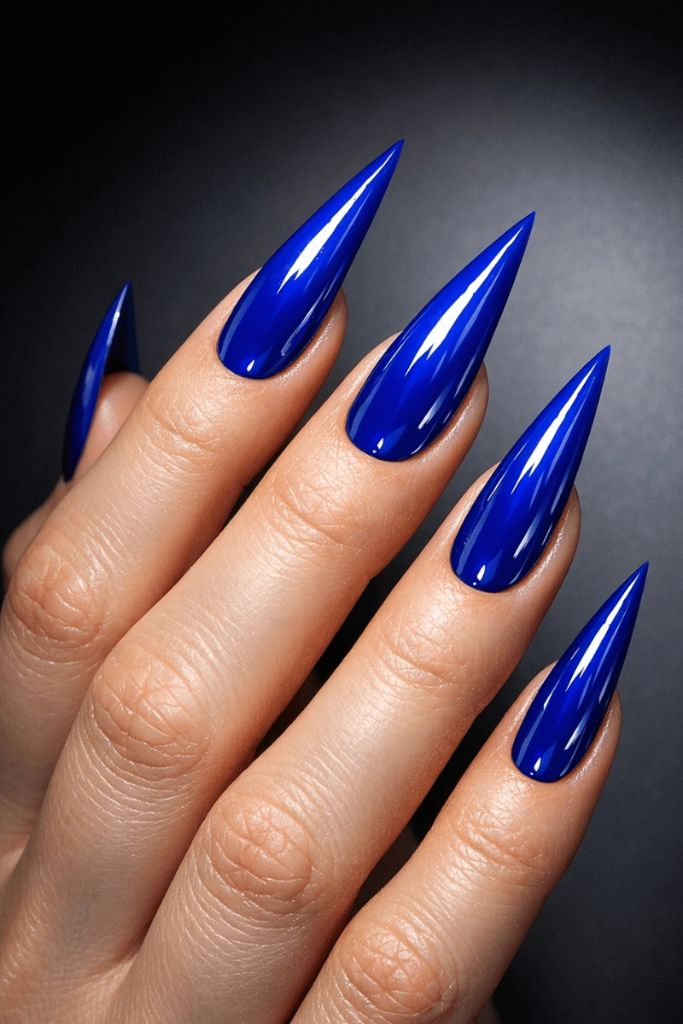 These electric royal blue chrome stilettos are a marvel of reflective finish work. The mirror-like surface catches every flicker of ambient light and bounces it back in deep, royal sapphire tones — photographed here against a dark grey background, which makes the color appear almost bioluminescent. This is glamorous stiletto nails designs at their most technically impressive, and it’s a look that reads equally well in natural spring sunlight as it does under the warm glow of an evening venue.