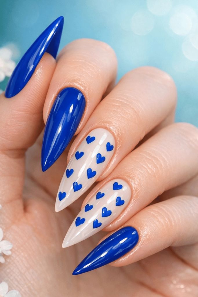 These alternating royal blue and sheer nude stilettos scattered with cobalt heart prints absolutely made my heart skip when I first saw them. The combination feels fresh and youthful — exactly what bold spring nail trends 2026 should feel like. Two nails go full royal blue gloss, while the remaining nails feature a sheer milky base dotted with perfectly placed blue heart motifs. It’s playful, it’s feminine, and it manages to feel both casual and curated at the same time.