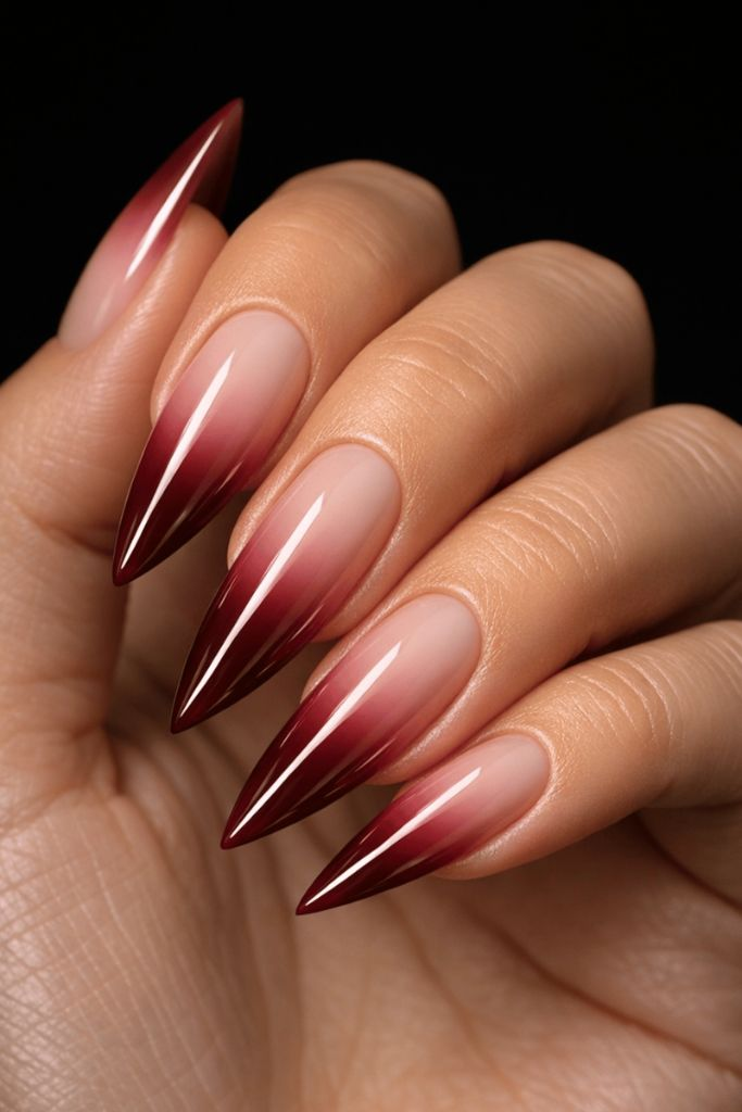 This rich burgundy ombré fading into a soft nude silk base is the kind of classy stiletto manicure idea that looks like it belongs in a high-fashion editorial — all black backdrop, moody lighting, and an impossible amount of elegance per square inch of nail. The gradient runs from a deep wine-red at the very tip, softening into a warm nude at the base, and the glossy topcoat makes the transition feel seamless and almost three-dimensional. It’s spring’s answer to the winter moody palette — a little dark, but beautifully soft.