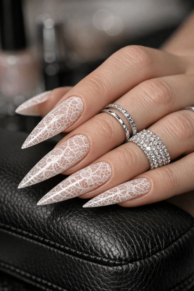 White lace print over a warm nude base, paired with stacked diamond and silver rings — this is a bridal-coded classy stiletto manicure idea that somehow also works for everyday luxury. The intricate lace-like pattern is delicate and ultra-feminine, and on the long stiletto shape it reads almost like a couture gown textile translated onto a nail. The overall effect is soft, romantic, and achingly beautiful — like something you’d see displayed behind glass in a bridal boutique.