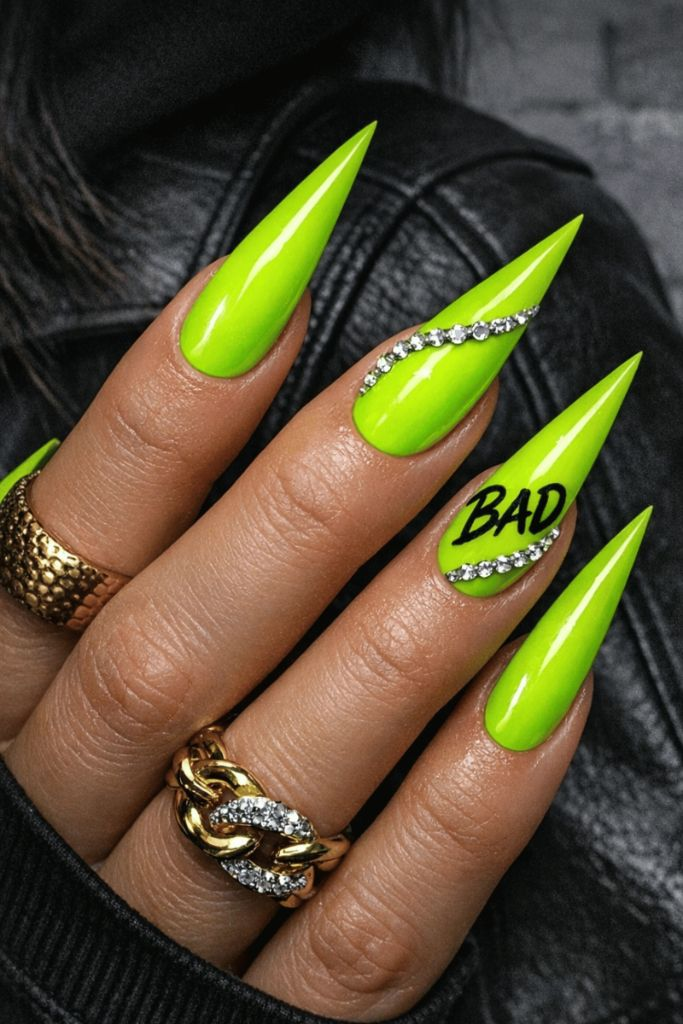 Let me be very direct: these neon lime green stiletto nails with a rhinestone diagonal swipe and bold black “BAD” typography on the accent nail are exactly the kind of bold spring nail trends 2026 that make people stop scrolling. Against a black leather background, paired with a chunky gold chain ring, they practically vibrate off the screen. This is nail art as a personality statement — confident, rebellious, and absolutely unapologetic about taking up space.