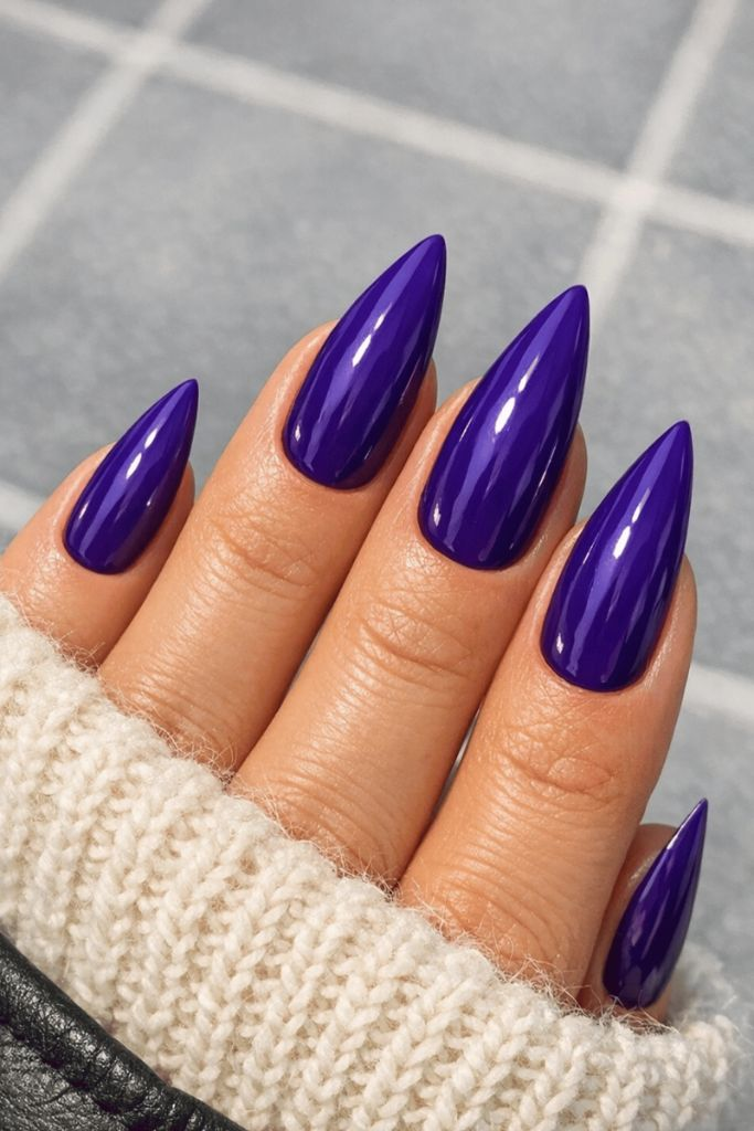 These gorgeous deep violet nails — glossy, smooth, and utterly pristine — hit the perfect balance between dramatic and wearable. The color is rich and saturated, sitting somewhere between a true purple and a deep indigo, and the high-shine finish on the almond-shaped stiletto tip makes them look almost edible. Set against a neutral tile background with a cozy knit sweater cuff in the frame, they feel both luxurious and approachable — which is a rare and wonderful combination.