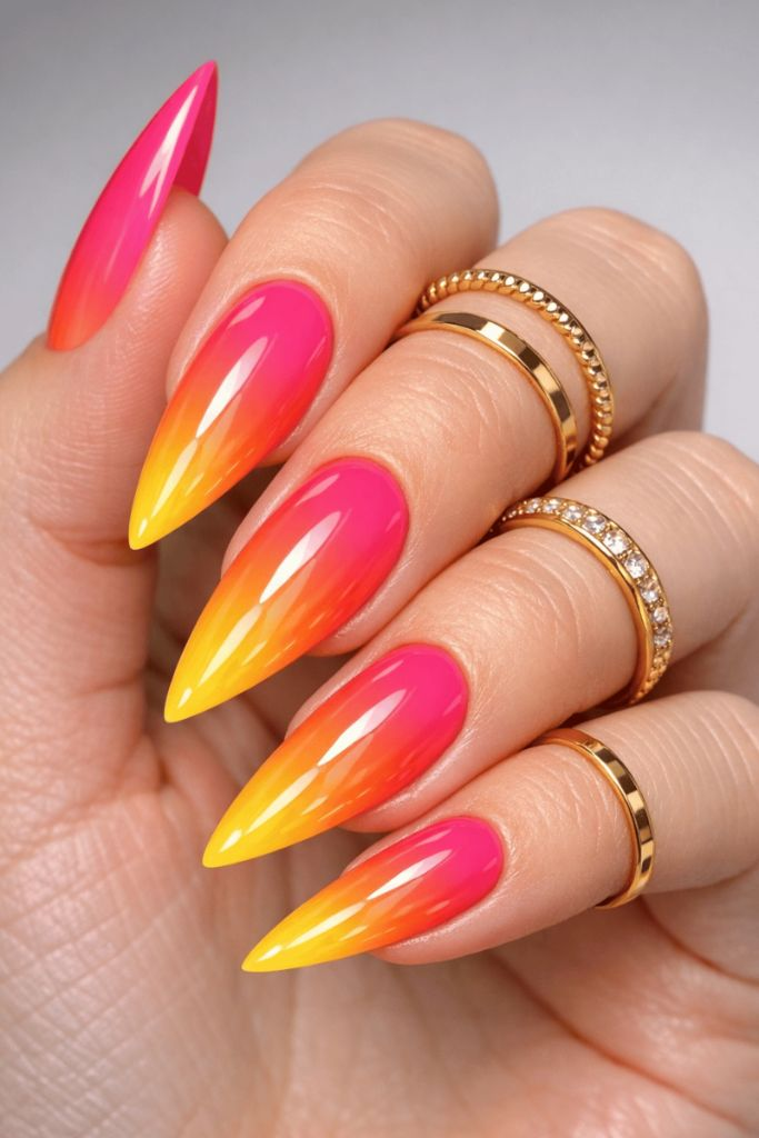 If spring had a gradient, it would look exactly like this — a blazing ombré sweeping from hot fuchsia at the base up through tangerine orange and into golden yellow at the tip, the whole thing set ablaze under warm lighting. These long stiletto nails ideas are pure energy. Paired with gold stacked rings, they feel like a fashion editorial straight out of a tropical issue of Vogue Mexico. Every finger is its own little sunset, and together they form a cohesive, jaw-dropping composition.