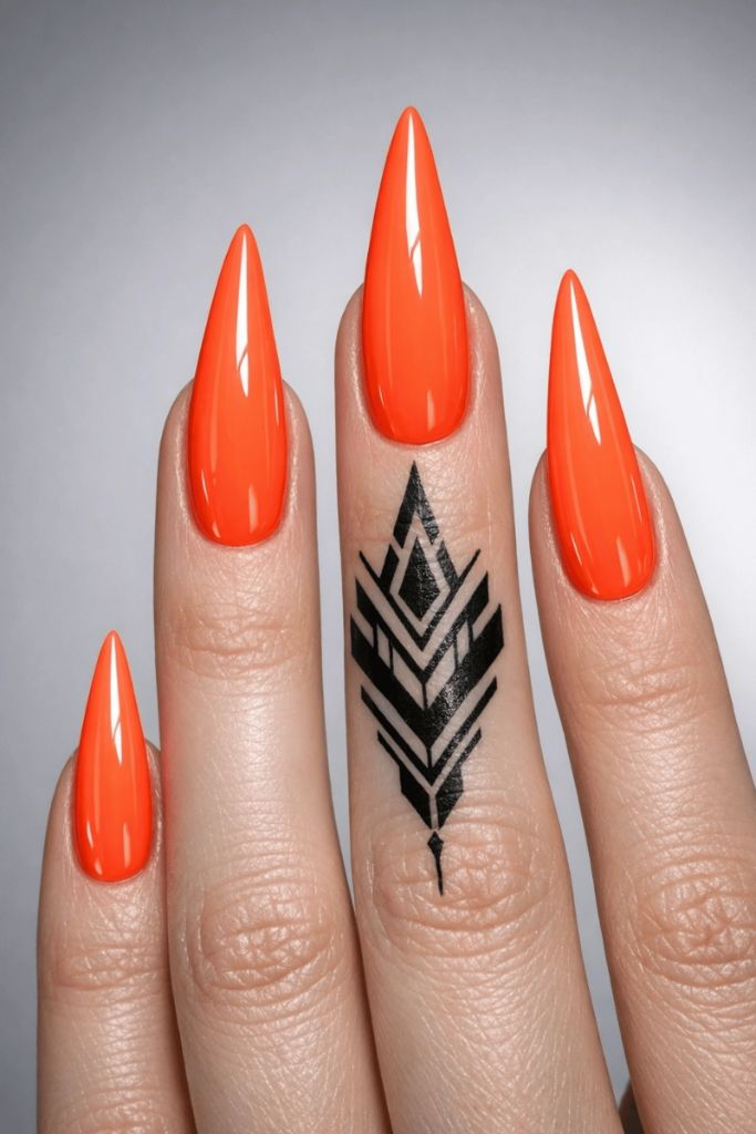These vivid neon coral stilettos are stunning on their own, but styled here with a bold geometric diamond-shaped finger tattoo running the length of the middle finger, they become a full lifestyle aesthetic. The coral tone is electric — somewhere between a traffic cone orange and a bright salmon — and it photographs with incredible vibrancy against a grey studio backdrop. This is one of the most unexpected and exciting pointed nail designs spring 2026 interpretations I’ve come across: nail art meets body art in the most visually striking way.