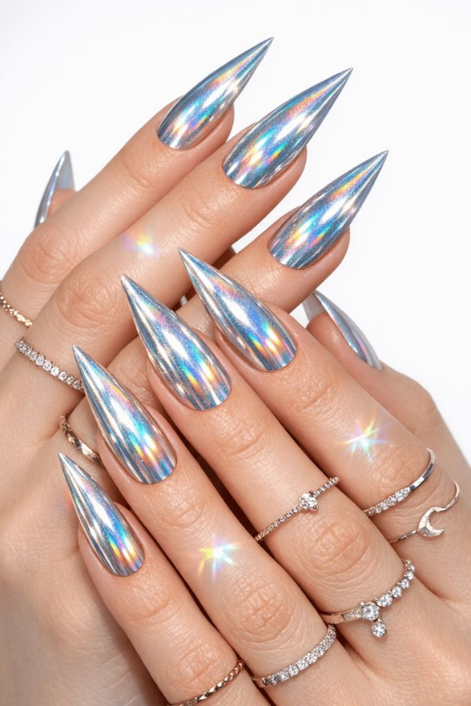 I have to be honest — when I first saw these holographic chrome silver stilettos, I actually gasped. The way the iridescent surface catches light and breaks it into rainbow starburst reflections, combined with the extreme length of the stiletto shape and the delicate stacked silver rings and moon charm jewelry — it’s otherworldly. These chrome stiletto nails are not just a manicure; they’re a sci-fi fantasy brought to wearable life. Spring 2026 has absolutely embraced futurism, and this look is its most spectacular ambassador.