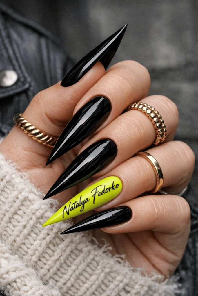 These intensely long, ultra-pointy black stiletto nails — most of them glossy jet black, with one statement neon yellow accent nail bearing a signature script — are the definition of editorial contrast. The extreme length of the stiletto shape makes them look almost sculptural, and the unexpected pop of chartreuse against all that black is electric. Paired with layered gold rings, they project an image that is equal parts high fashion and underground cool. This is long stiletto nails ideas taken to their absolute maximum.