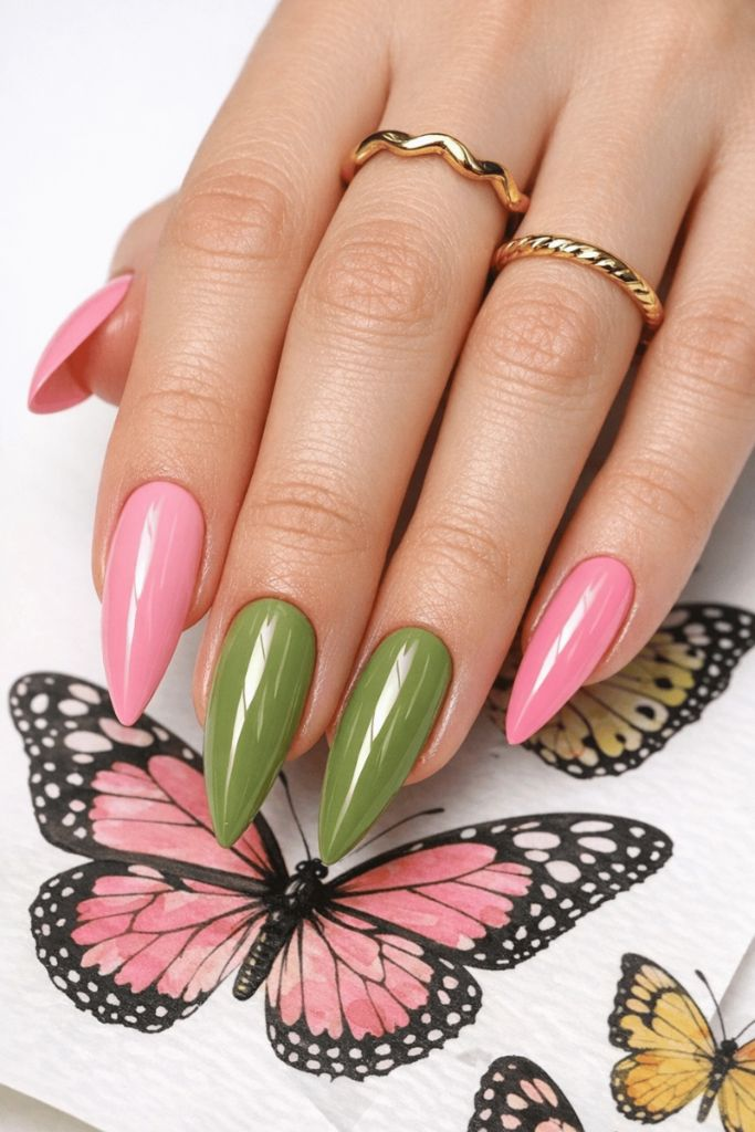 These alternating pink and olive green stilettos, photographed resting on a butterfly-print card, are a complete season in miniature. The warm bubblegum pink and earthy sage-green combination is unexpected and completely charming — it feels like a spring garden interpreted through a fashion lens, and the butterfly prop makes the whole image feel alive with seasonal energy. Paired with delicate gold wavy rings, this is one of the most classy stiletto manicure ideas that also happens to feel playful and fresh.