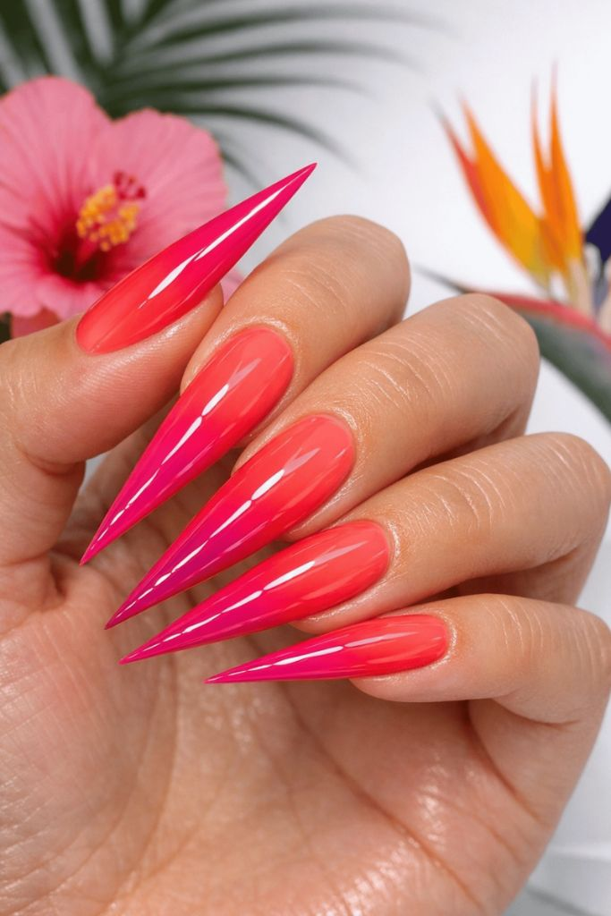 These translucent jelly-finish stilettos blend from a warm coral at the base into a vivid hot pink at the tip, the whole look photographed in natural light against tropical flowers — a bird of paradise and a pink hibiscus in the background. The jelly finish gives the nails a glass-like quality, as though they’re made of colored resin rather than polish, and the color transition is seamlessly beautiful. These are pink spring stiletto nails reinvented through a tropical, maximalist lens.