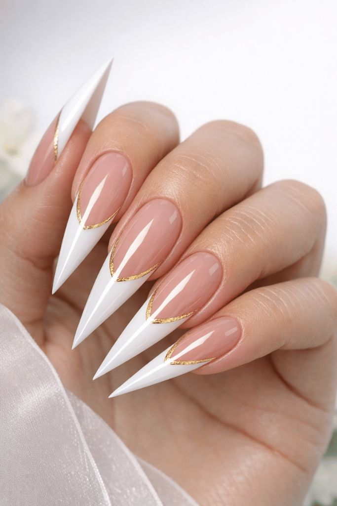 The classic French manicure has never looked like this. These nude-base stilettos feature crisp white V-shaped French tips on the pointed end, each tip bordered by a delicate line of gold glitter — creating a chevron effect that elevates the traditional French into something genuinely spectacular. Photographed with a silky ribbon in the background, the overall look is bridal-adjacent but completely wearable for any spring occasion. This is arguably the most elegant classy stiletto manicure idea on this entire list.