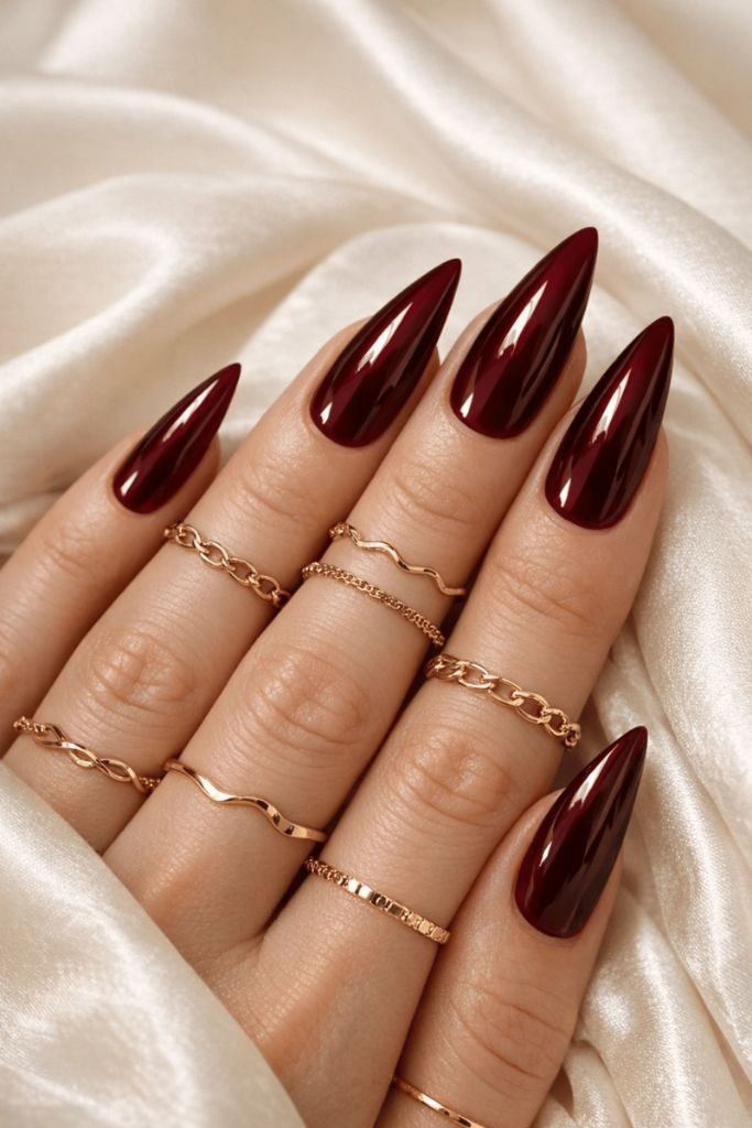 Draped against cream satin fabric and adorned with delicate gold chain knuckle rings in various styles, these deep burgundy stilettos are a love letter to opulence. The color — a true, deep wine red with near-black depth — reads differently against every surface: against the pale satin, it looks dramatic and romantic; against skin, it looks warm and sophisticated. This is one of the richest and most beautiful glamorous stiletto nails designs of the season.