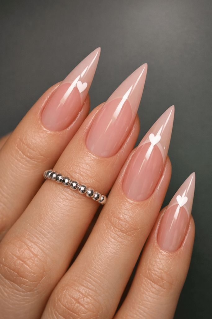 These gossamer-soft nude stilettos feature the most subtle, perfectly placed white heart motifs — one per nail, nestled near the base, barely-there but undeniably precious. Against a dark grey background with a simple silver beaded ring, they feel like the most refined expression of pastel stiletto nails possible: not loud, not overdone, but deeply considered. This is quiet luxury nail art, and it speaks volumes.