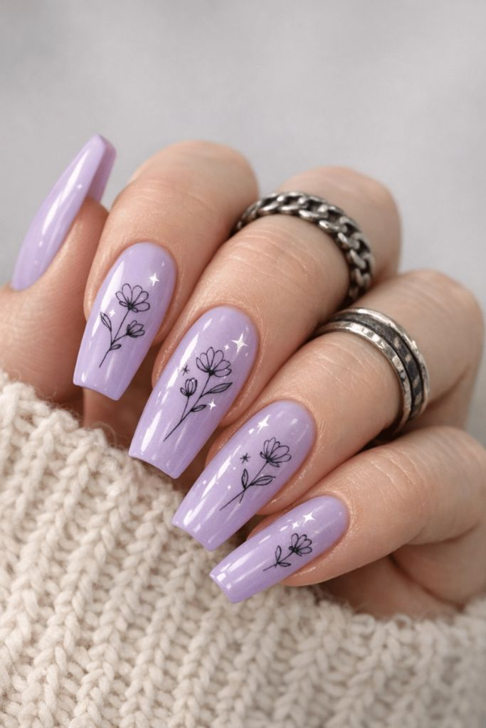 The combination of soft color and hand-drawn detail gives this look an artisanal quality that no sticker or stamp can replicate. And honestly, lavender florals on a coffin nail shape might be the most perfectly spring-forward thing you could wear to an outdoor brunch or a botanical garden visit.