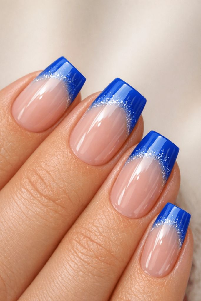 To recreate this at home, use a nail guide strip to achieve a clean French tip line, then paint two coats of a royal blue polish — DND Duo Gel & Polish in “Electric Blue” is perfect for this. While the color is still slightly tacky, press fine silver holographic glitter into the border zone using a flat eyeshadow brush. This creates that seamless, sparkly fade that makes the design look professionally done. Finish with a matte-to-gloss top coat for a sleek, salon-quality result.