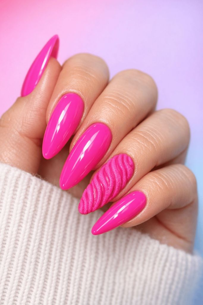 Hot pink has always been a personality, not just a color. This design takes neon fuchsia almond nails and elevates one accent nail with a gorgeous 3D wave texture — the same pink but with a velvet, ridged, tactile quality that makes you want to run your fingers across it constantly. As someone who loves neon spring nails energy, this hits every mark: it is loud, joyful, and undeniably vacation-coded. There is something about this particular shade of pink against sun-kissed skin that feels like it was designed specifically for holding a tropical cocktail.
