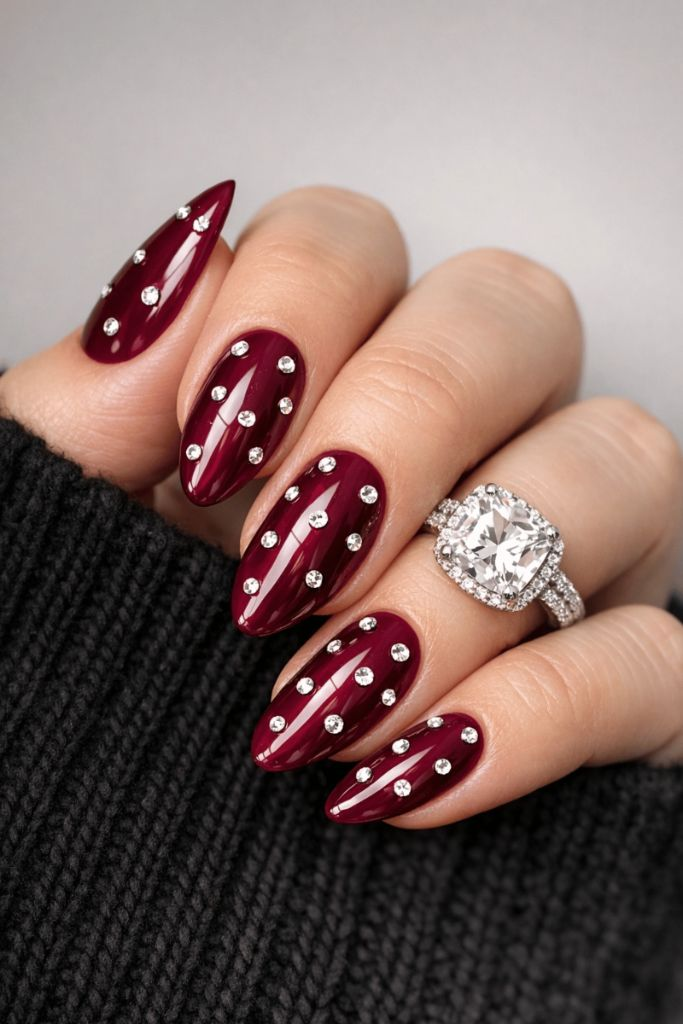 4. Deep Burgundy Almond Nails With Crystal Studs