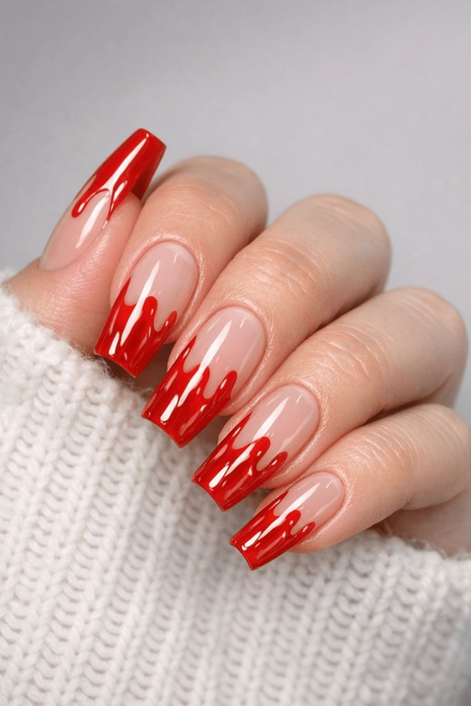The red drip effect is achieved by painting a standard red French tip first, then using a thin nail art brush dipped in the same red to draw downward-flowing drip lines of varying lengths while the tip polish is still slightly wet. This allows the drips to blend at the top for a seamless effect. I recommend using Gelish Harmony in “Ripe for Love” for a vivid, saturated red that stays true even in bright sunlight.