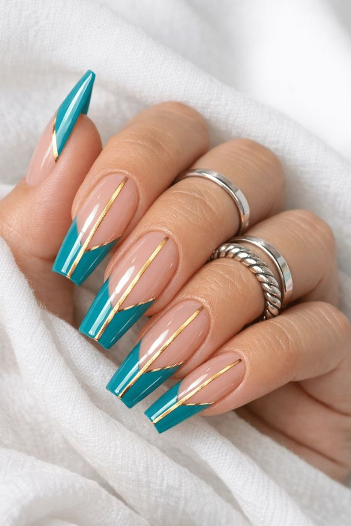 Teal and gold together feel like a five-star resort — that combination of ocean-deep color and warm metallic shimmer is genuinely luxurious. This design features long coffin nails with a sheer base and structured teal French tips bisected by clean golden lines, creating a geometric, almost architectural quality that elevates the classic French manicure into something truly modern. For tropical nail designs lovers, this is the grown-up, resort-ready version of everything you have been dreaming about.