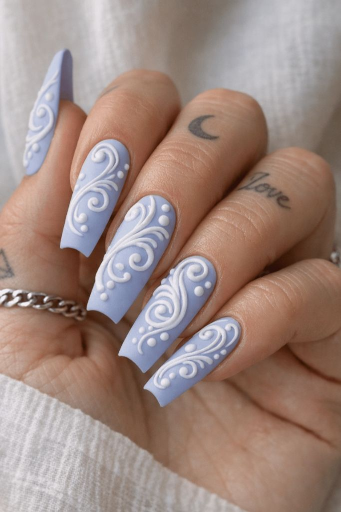 The matte periwinkle base is best achieved with a light blue gel polish topped with a matte finish top coat — Sally Hansen Miracle Gel in “Azure Wish” topped with OPI Matte Top Coat creates the perfect texture. The 3D swirls are piped using white acrylic or builder gel loaded into a small piping bag or fine-tip applicator, following baroque flourish patterns before curing. This takes patience but the result is genuinely gallery-worthy.
