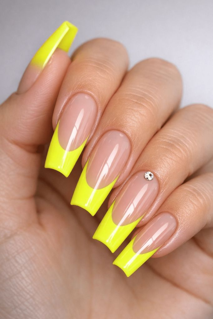 If there is one color that has absolutely no interest in being ignored, it is neon yellow. This design takes long coffin nails with a classic sheer nude base and floods the tips with the most electric, eye-scorching yellow imaginable — finished with a single crystal accent on one nail that adds just enough elegance to balance the vibrancy. This is peak neon spring nails energy, and it is completely irresistible for anyone heading somewhere warm and sunny.