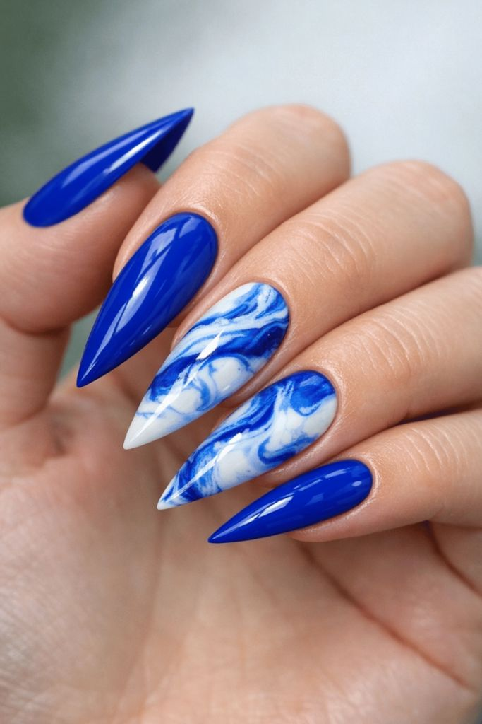 Royal blue and marble were made for each other. This design pairs long, sharp stiletto nails in a deep, saturated royal blue with two accent nails featuring a stunning blue and white marble swirl pattern — the kind of pattern you see on expensive Italian ceramics or luxury bathroom floors. The contrast between the solid bold nails and the intricate marbled accents creates a sense of visual balance that makes the whole look incredibly sophisticated. For beach vacation nails, this brings a distinctly Mediterranean energy.