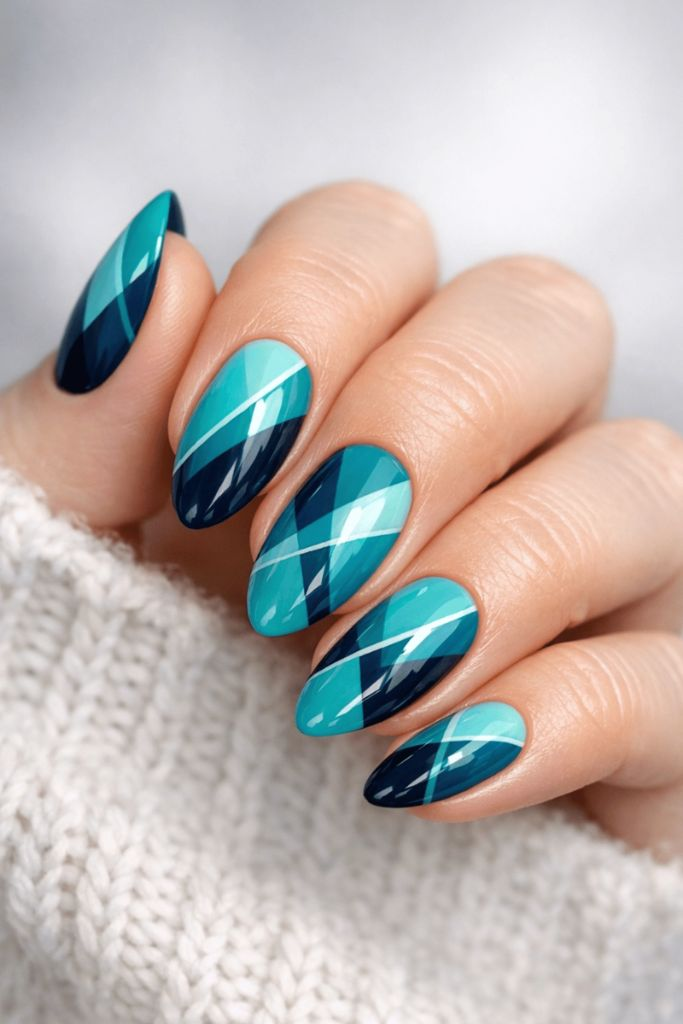 Argyle on nails is a pattern I never knew I needed until I saw it executed in teal and navy blue, and now I cannot stop thinking about it. These medium almond nails feature a sophisticated diamond-check pattern in layered tones of aqua, teal, and deep navy, separated by fine white lines that give the whole design a crisp, graphic quality. It reads as preppy but modern — like a luxury beachwear brand designing their own nail collection.