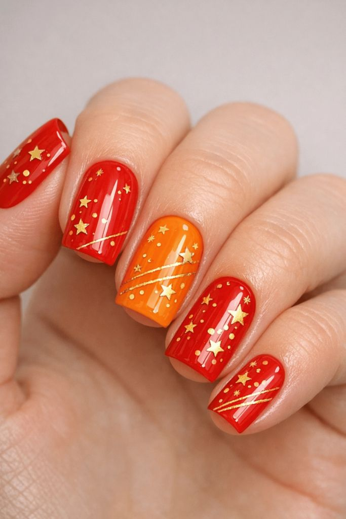 This design is a celebration on your fingertips. Short square nails split between vivid red and warm tangerine orange, decorated with gold star decals, tiny dots, and diagonal golden foil lines that streak across each nail like shooting stars. It is festive, energetic, and deeply joyful — the kind of manicure that reflects a mood rather than just a trend. Every time I look at designs like this, I think of fruity nail art ideas and sunny terracotta tones coming together in the most electric way.