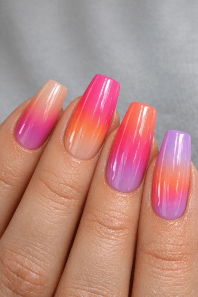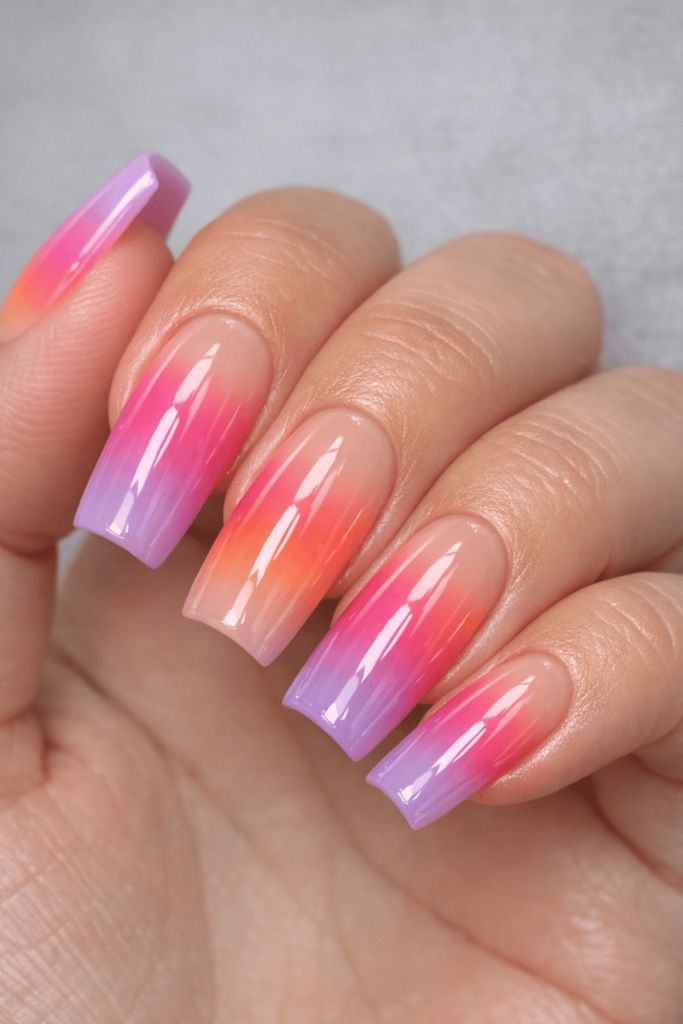 There is something almost meditative about watching a sunset, and this design captures that exact feeling and transfers it directly onto long coffin nails. The ombre blends from a warm, sheer peach at the cuticle through hot pink, orange, and into a soft lilac at the tip — a full spectrum of sunset in miniature. This is ombre colorful nails at its most poetic, and the translucent, glass-like finish makes it look like you are wearing light itself.