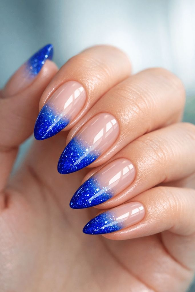 13. Royal Blue Glitter Ombre Stiletto Tips