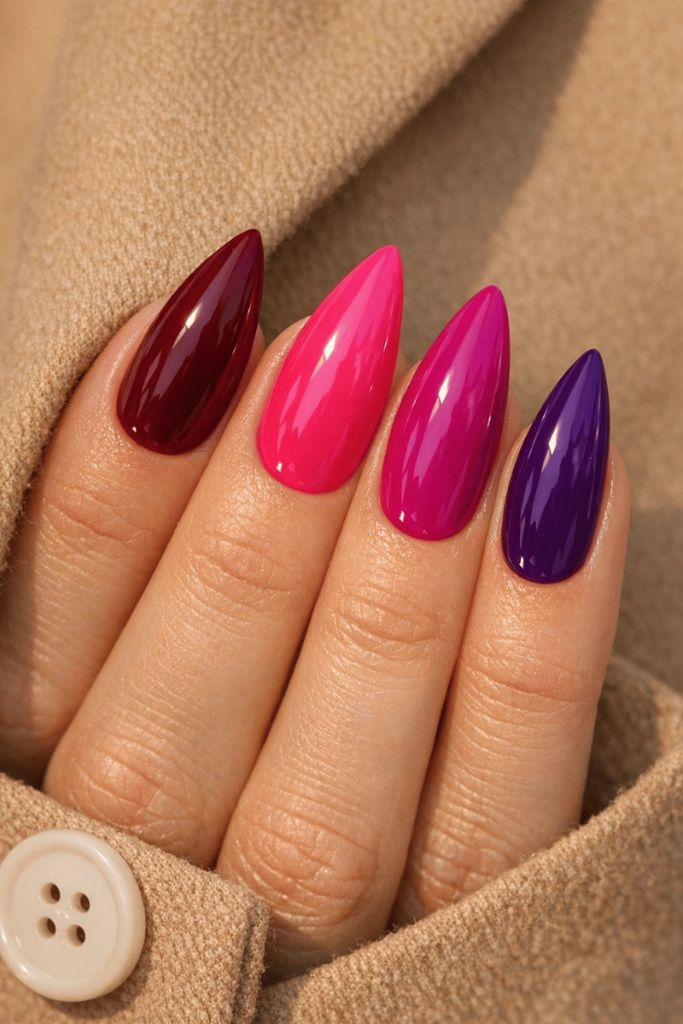 This look is pure joy in nail form. Four almond-shaped nails, each painted in a different jewel-toned jelly finish — deep burgundy, hot pink, magenta fuchsia, and rich purple — arranged across the hand in a gradient of warmth and vibrancy. There are no embellishments, no nail art, no accents. Just four perfect, glossy, deeply saturated jelly nails that are beautiful purely because of their color. This is the bright spring nails 2026 approach at its most confident and self-assured.