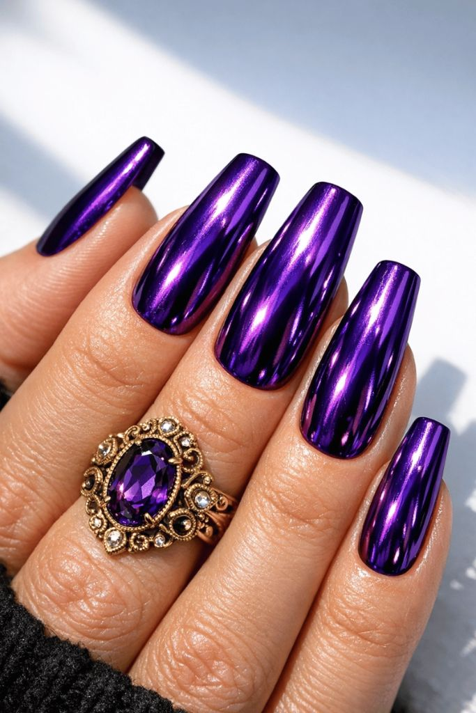 If there is a single nail design in this entire collection that stops the scroll immediately, it is this one. Long coffin nails coated in a mirror-chrome purple that is so reflective, so deeply violet, and so profoundly metallic that they genuinely look like they have been dipped in liquid amethyst. This is vacation gel nail ideas at its most dramatic — the kind of nails you wear when you want to arrive somewhere and have it register as an event.