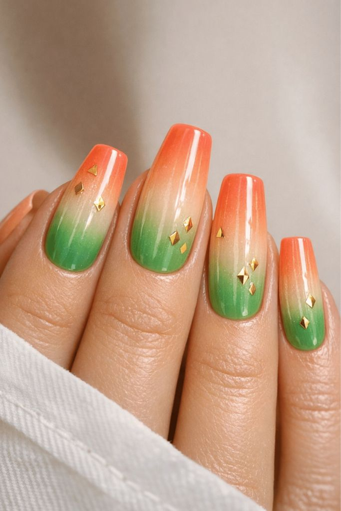16. Orange and Green Ombre Coffin Nails With Gold Studs