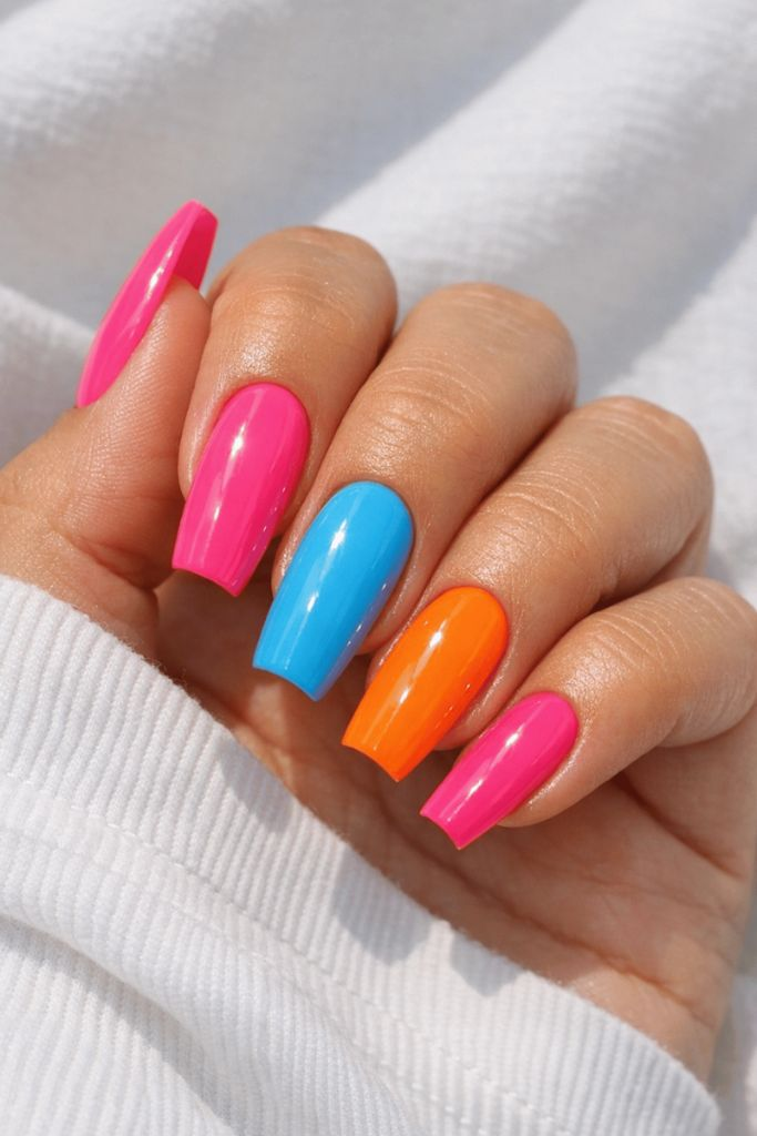This is the nail look for people who refuse to choose a favorite color — and that is a perfectly valid and beautiful philosophy. Long coffin nails divided between hot pink, sky blue, and tangerine orange create a vivid, maximalist color story that feels like summer condensed into five nails. There is no pattern, no gradient, no art — just pure, saturated, neon color arranged across the hand in a playful random sequence that feels joyful every single time you look at it.