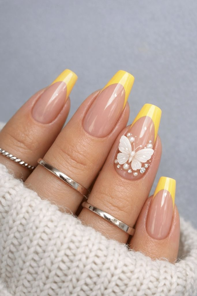 There is a moment every spring when butterflies appear, and it feels like a small annual miracle. This nail design captures that exact feeling — medium coffin nails with a clean nude base and bright yellow French tips, with one nail featuring a raised 3D white butterfly surrounded by tiny pearls and crystal accents. It is sweet without being saccharine, spring-forward without being juvenile, and genuinely one of the most charming designs in this entire collection.