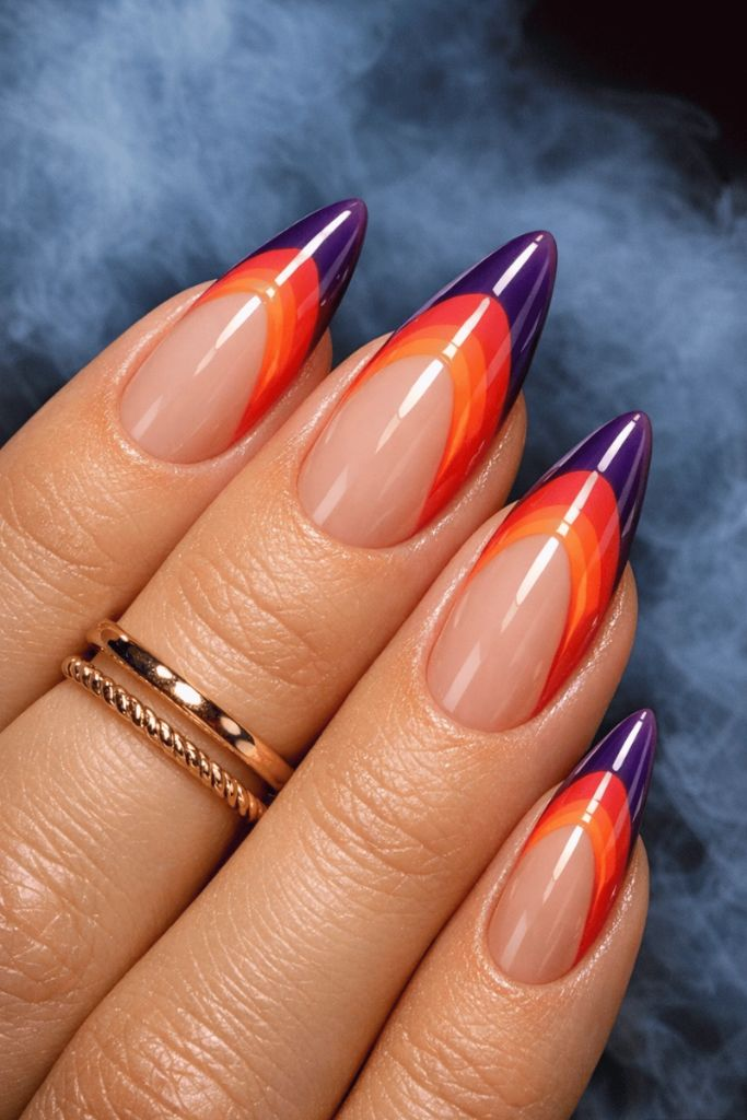 We close this collection with one of the most visually striking designs of the entire group — and it deserves that final position completely. Almond stiletto nails with a sheer nude base and stacked, layered French tips in purple, deep red, and orange, each curved line nested inside the previous one to create a sunset rainbow effect at the tip. The smoky background in the photograph makes the jewel tones burn even brighter, and the overall effect is nothing short of spectacular. This is spring vacation nails 2026 at its most editorial.