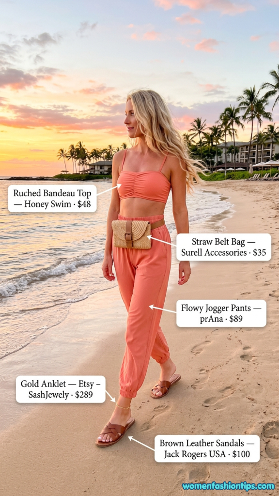 Honey Swim makes the bandeau top featured here, and the fit is genuinely flattering across different body types. The ruching adds texture and dimension, while the jogger pants from prAna in this same warm coral create a cohesive, coordinated feel. Add a straw belt bag to keep your hands free for collecting shells or snapping sunset photos. It’s functional styling at its best — everything you need, nothing you don’t.