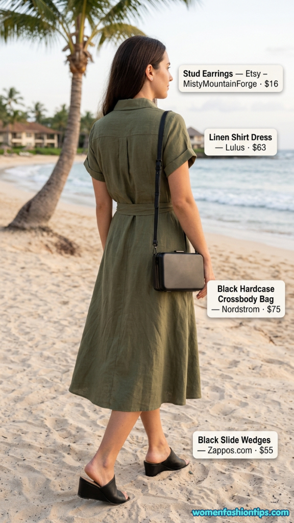 Shop This Look: The Linen Shirt Dress is from Lulus at $63 — shop it here. The Stud Earrings from Etsy seller MistyMountainForge at $16 — grab them here. The Black Hardcase Crossbody Bag from Nordstrom at $75 — find it here. And the Black Slide Wedges from Zappos.com at $55 — shop them here.