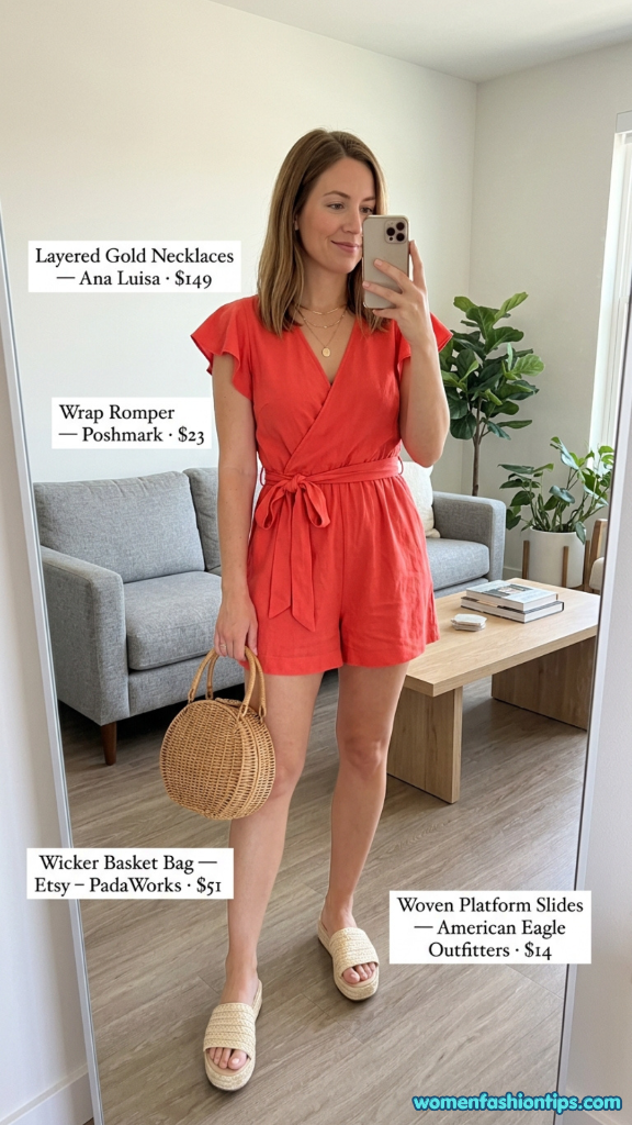 This particular romper was sourced from Poshmark, which is a reminder that sustainable, secondhand fashion can be just as stylish as anything brand new. Pair it with woven platform slides from American Eagle Outfitters — they add a bit of height while keeping the vibe casual and beachy. The round wicker basket bag from Etsy seller PadaWorks completes the look with that handmade, artisanal quality that photographs beautifully.