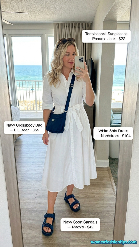 Shop This Look: The Tortoiseshell Sunglasses are from Panama Jack at $22 — shop them here. The White Shirt Dress from Nordstrom at $104 — find it here. The Navy Crossbody Bag from L.L.Bean at $55 — grab it here. And the Navy Sport Sandals from Macy’s at $42 — shop them here.