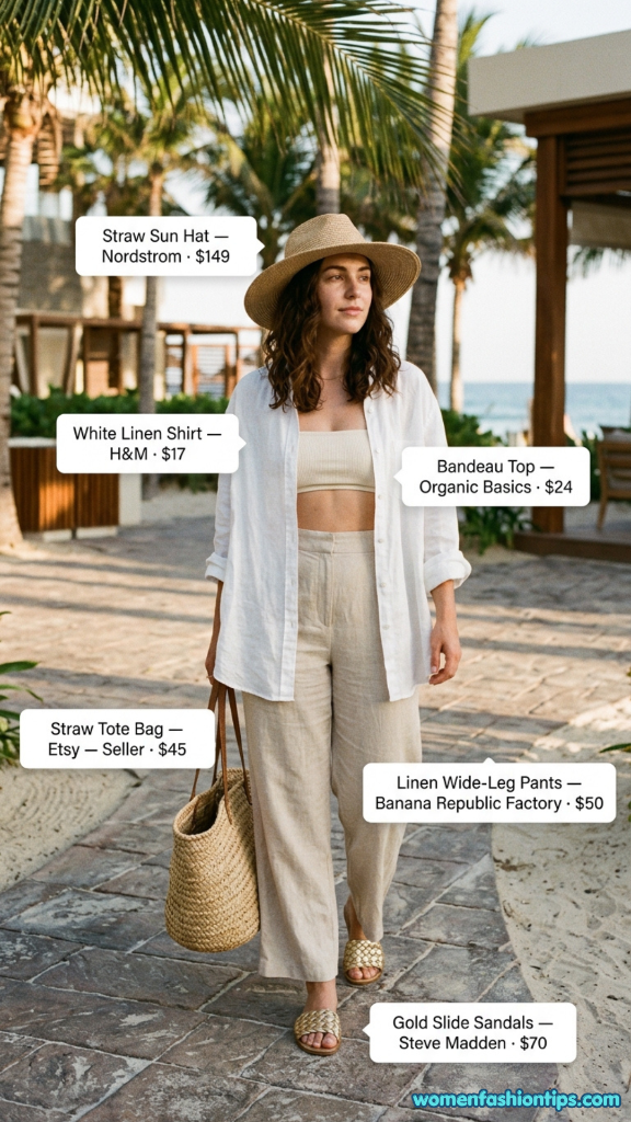 Shop This Look: The Straw Sun Hat is from Nordstrom at $149 — shop it here. The White Linen Shirt from H&M at $17 — grab it here. The Bandeau Top from Organic Basics at $24 — find it here. The Straw Tote Bag from Etsy at $45 — shop it here. The Linen Wide-Leg Pants from Banana Republic Factory at $50 — get them here. And the Gold Slide Sandals from Steve Madden at $70 — shop them here.