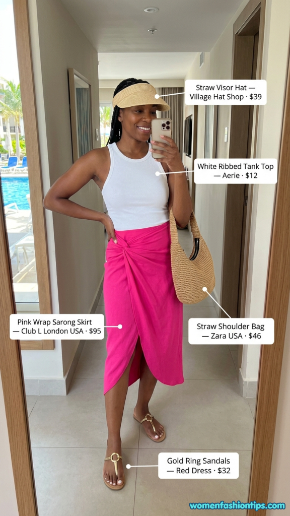 Hot pink on vacation? Absolutely yes. This look pairs a knotted wrap sarong skirt in the most vibrant fuchsia with a simple white ribbed tank top, and the combination is pure summer joy. The sarong’s asymmetric hemline adds movement and visual interest, while the white tank grounds the look and keeps it from feeling costume-y. It’s one of those stylish beach outfits women summer suitcases need because it transitions seamlessly from poolside to exploring town.