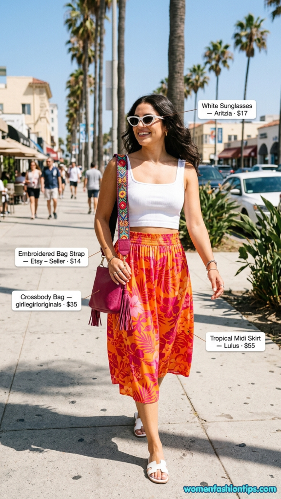 If there’s one print that says “I’m on vacation and I’m loving it,” it’s a bold tropical floral. This outfit pairs a vibrant orange-and-pink midi skirt from Lulus with a simple white square-neck crop top, and the result is absolutely joyful. The skirt does all the talking here — the oversized hibiscus and palm leaf print pops in the sunlight, and the elastic waistband means comfort is never sacrificed for style. As summer beach outfits women 2026 go, this one brings the energy.