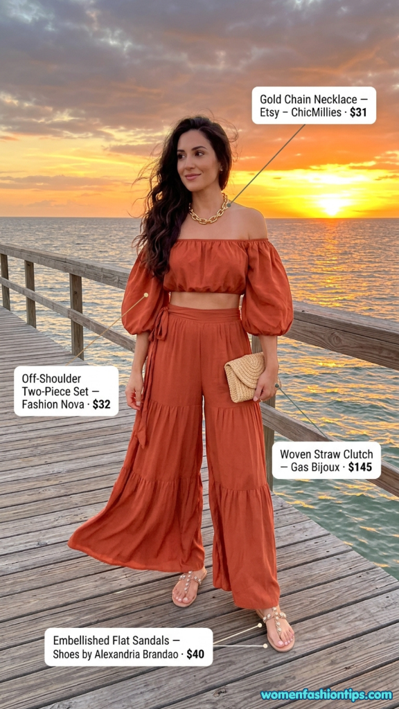 Few things are more photogenic than a flowing outfit on a dock at sunset, and this burnt orange off-shoulder two-piece set delivers that dreamy visual in spades. The balloon sleeves on the crop top are dramatic in the best way — they catch the breeze and frame the shoulders beautifully. The wide-leg tiered pants add movement and romance, creating a silhouette that feels like it belongs in a destination wedding lookbook. It’s absolutely one of the most striking chic summer beach outfits women can try this season.