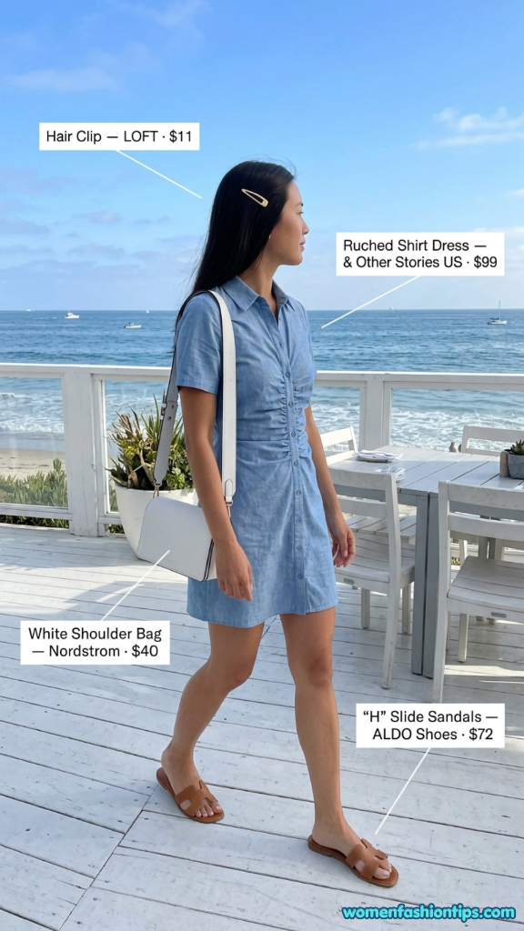 Chambray has this incredible ability to feel both casual and refined simultaneously, and this ruched shirt dress from & Other Stories captures that duality perfectly. The ruching along the front creates visual interest and a figure-flattering gather, while the collar and short sleeves keep the shirt dress structure intact. The light blue wash feels like wearing a piece of the sky — soft, calming, and endlessly versatile. For summer beach outfits women 2026, this is a go-anywhere, do-anything wardrobe workhorse.