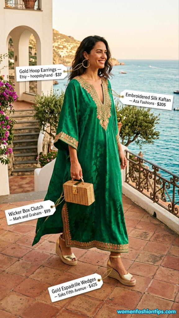 If there’s a single piece that makes me feel like I’ve been transported to the Amalfi Coast, it’s an embroidered silk kaftan in deep emerald green. This look is pure luxury — the rich color, the intricate gold embroidery along the neckline and hem, the generous flowing shape that moves like a dream. It’s the kind of piece you throw on over a swimsuit and suddenly look like you belong on a terrace overlooking the Mediterranean. Among all the stylish beach outfits women summer collections have offered this year, this kaftan stands in a class of its own.