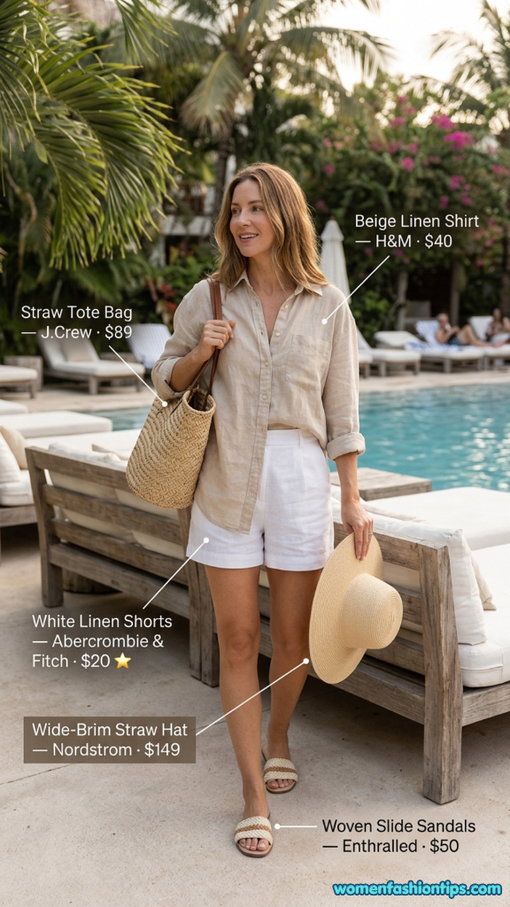 The beige linen shirt from H&M at forty dollars is another example of accessible fashion done right. The white linen shorts from Abercrombie & Fitch at just twenty dollars are a genuine steal — the relaxed fit and quality fabric punch well above their price point. The straw tote from J.Crew, wide-brim straw hat from Nordstrom, and woven slide sandals from Enthralled round out the accessories with that handcrafted, resort-town appeal that makes every photo look like a travel magazine spread.