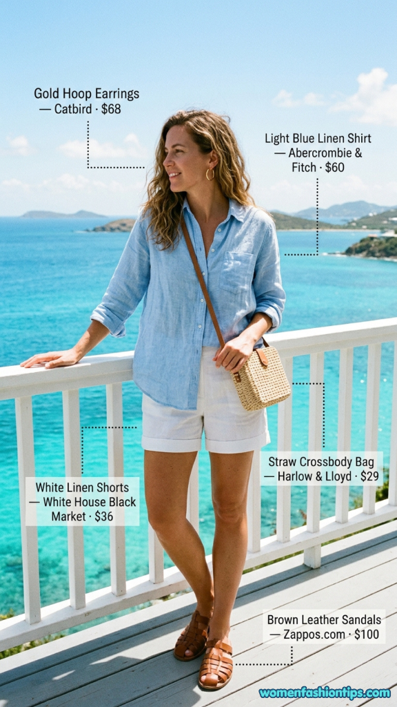 There’s something deeply satisfying about wearing soft blue with turquoise water in the background — it’s like the outfit and the destination were designed for each other. This light blue linen shirt from Abercrombie & Fitch, worn casually untucked over white linen shorts, captures that easy Caribbean vacation spirit perfectly. The rolled sleeves, the relaxed fit, the way the fabric catches the light — it’s beach vacation outfits women dream about when they’re sitting in an office counting down the days.