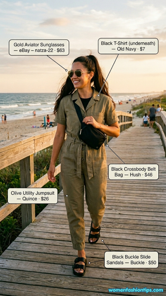 Jumpsuits are the unsung heroes of vacation packing — one piece, one decision, and you’re out the door looking completely put together. This olive utility jumpsuit from Quince at an astonishing twenty-six dollars is a prime example. The belted waist, rolled cuffs, and chest pockets give it that safari-meets-beach-town attitude that I find incredibly appealing. Worn over a simple black tee from Old Navy, it’s layered just enough for cooler evenings without adding bulk. For summer beach fashion women who value practicality and style equally, this is the answer.